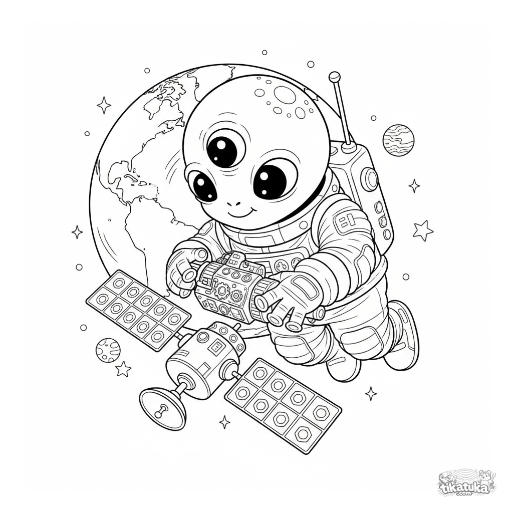 Сложная космическая раскраска: дружелюбный инопланетянин с тремя глазами ремонтирует спутник на орбите. Много деталей, для детей 7-12 лет.