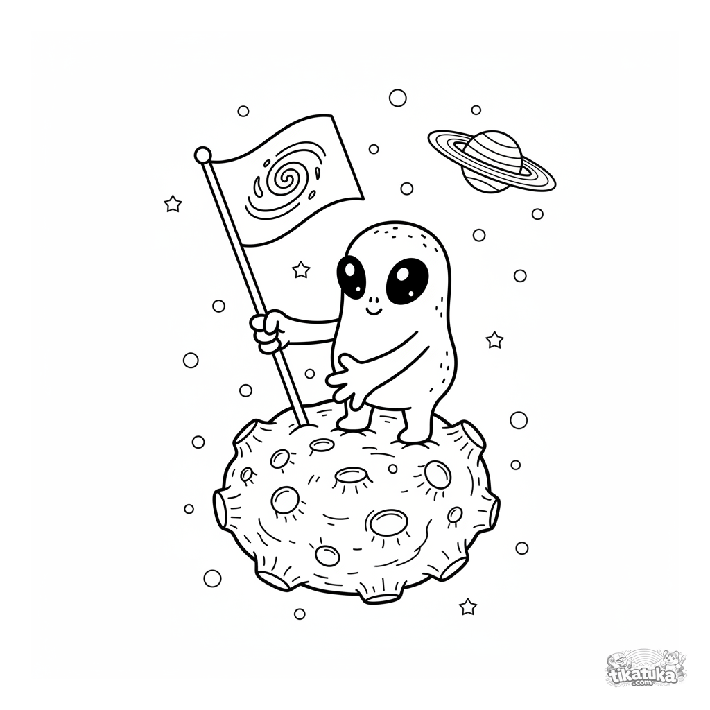 Космическая раскраска для детей 4-6 лет: добрый инопланетянин устанавливает флаг на маленьком астероиде. Простые формы и весёлый сюжет отлично подходят для первого знакомства с космосом.