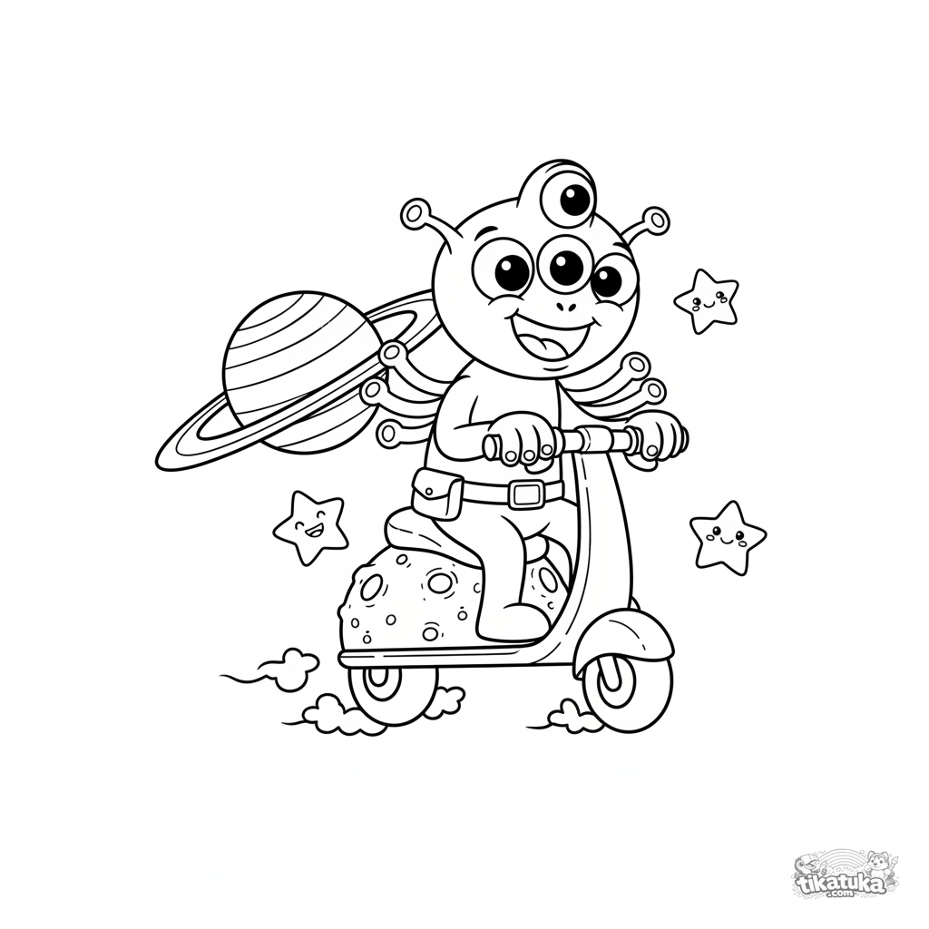 Космическая раскраска для детей 4-6 лет. Весёлый инопланетянин с тремя глазами катается на скутере из астероида мимо планет. Забавная фантастическая сцена.