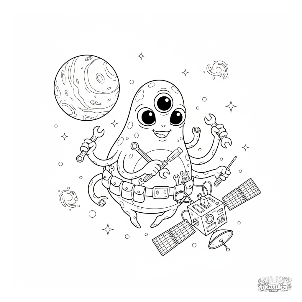 Сложная реалистичная раскраска на космическую тему для детей 7-12 лет: добродушный инопланетянин с щупальцами чинит спутник на орбите. Детализированная сцена с планетами и звёздами.