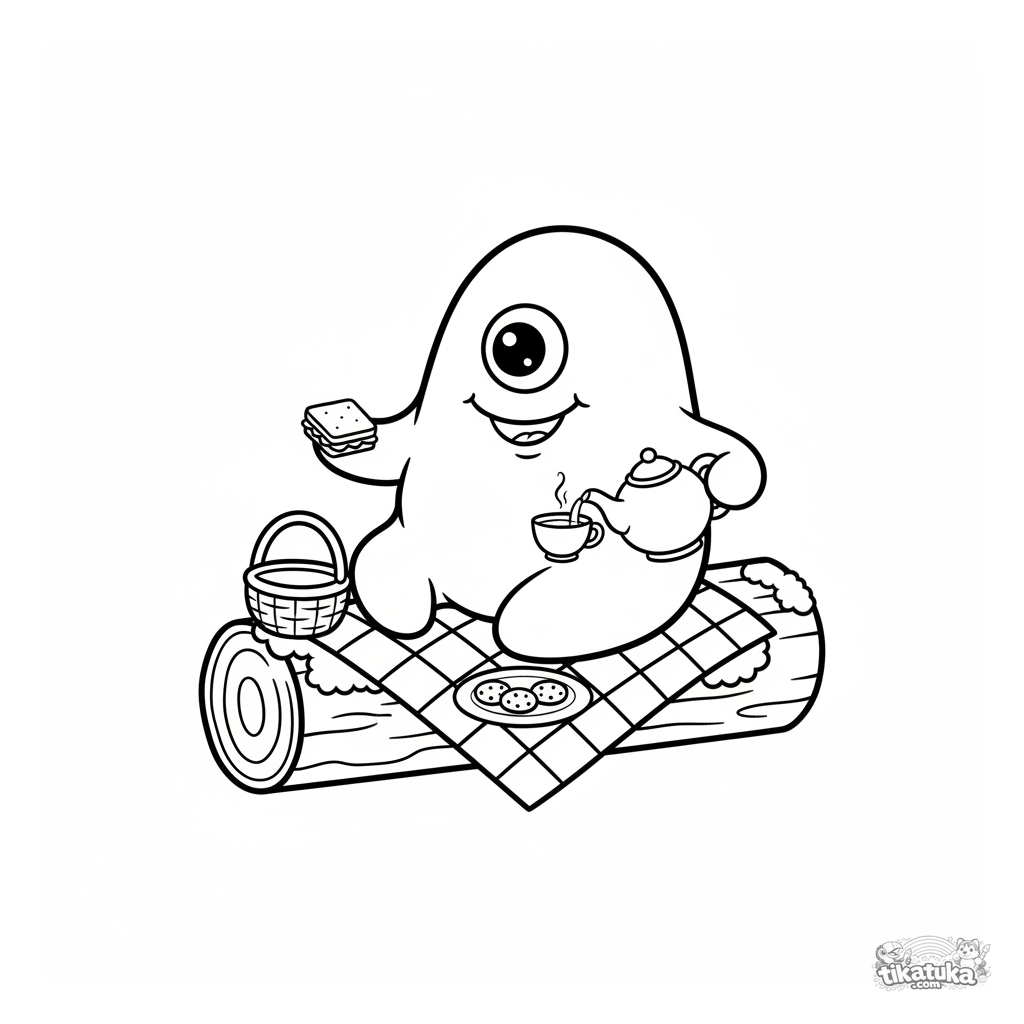 Простая и милая раскраска для малышей: дружелюбная амёба-микроб устроила пикник на моховом бревне. Крупные детали, толстые контуры.