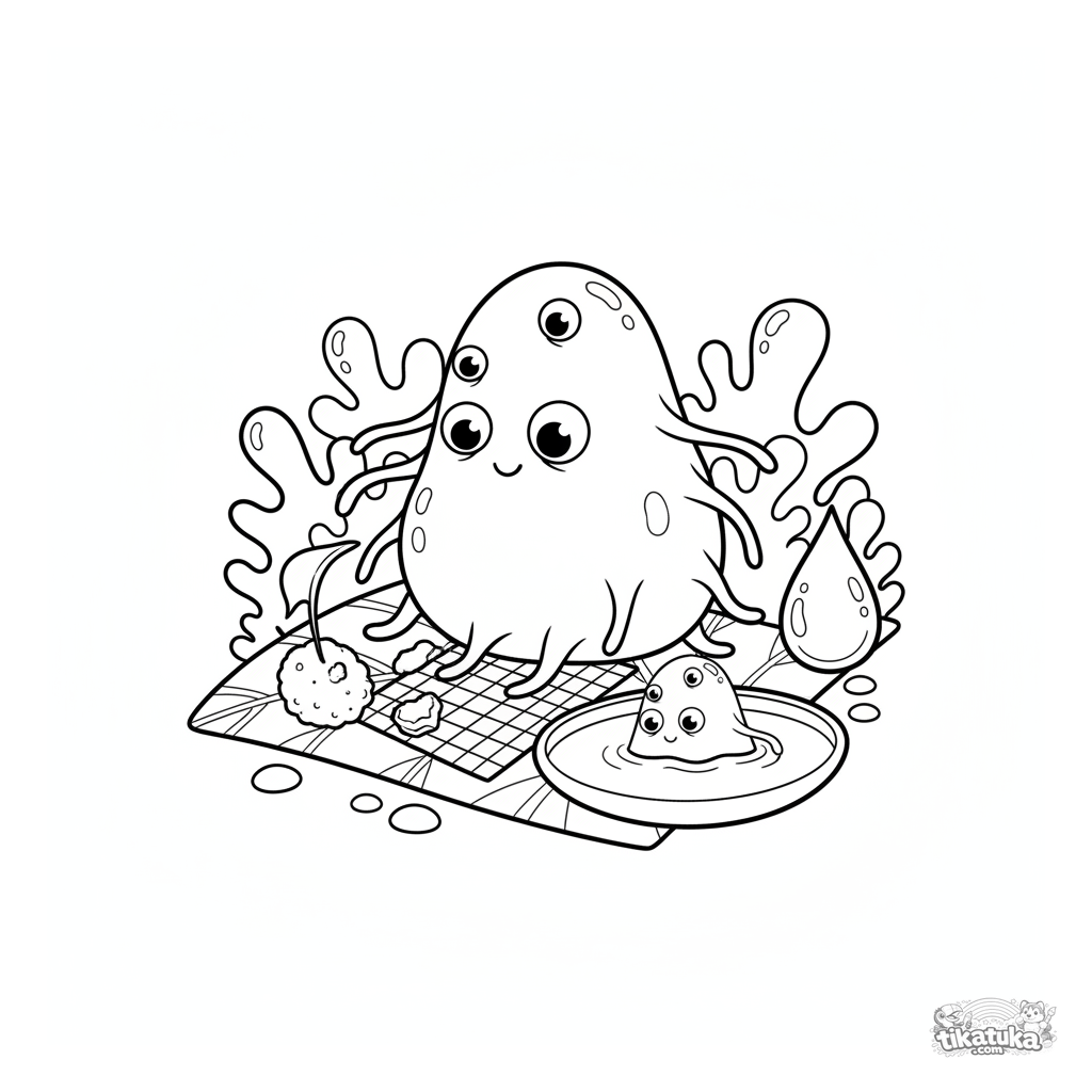 Забавная раскраска с дружелюбной мультяшной амёбой, которая устроила крошечный пикник на листе. Для детей 5-8 лет.
