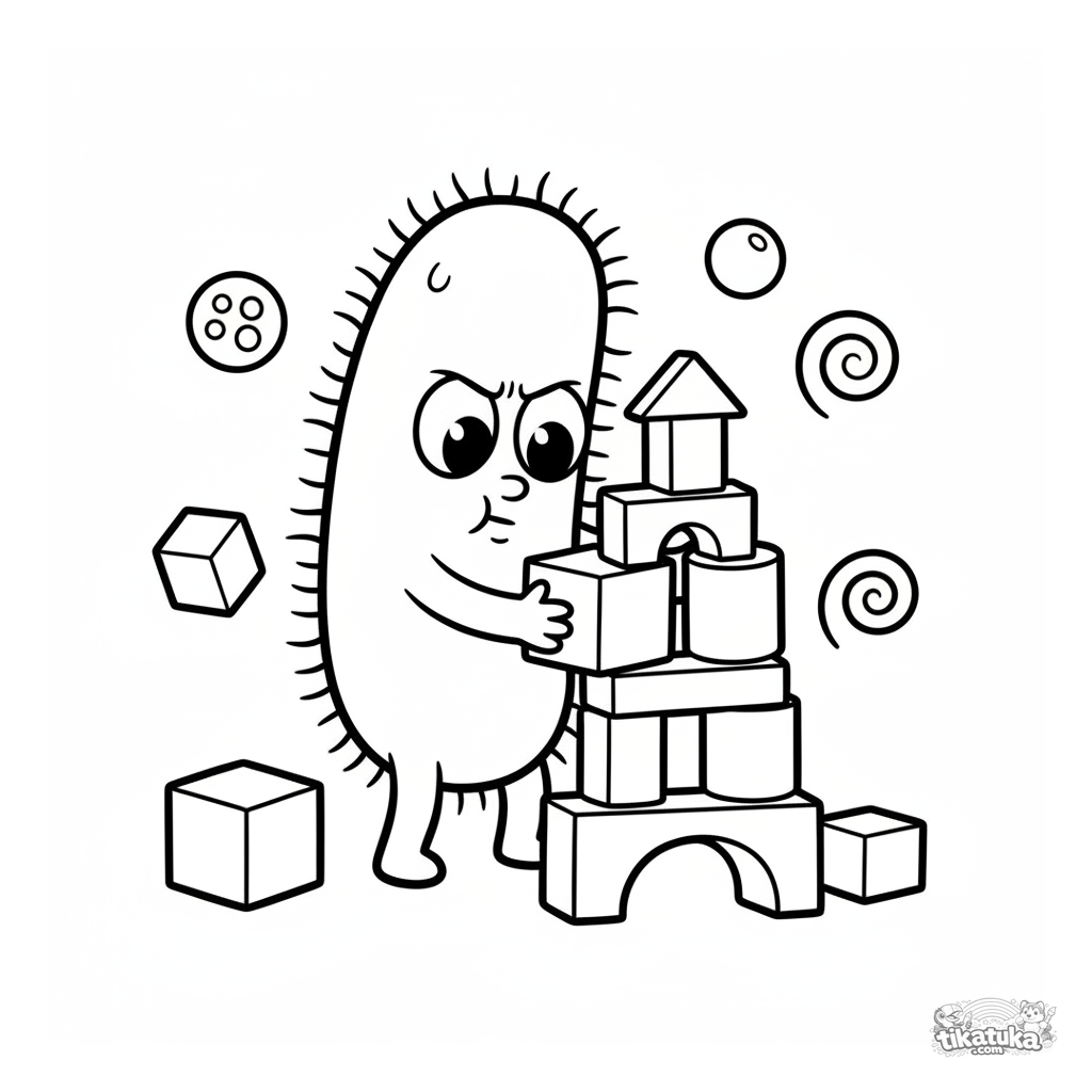Раскраска с дружелюбным микробом-бациллой. Для малышей 2-5 лет. Микроб строит башню из клеточных блоков, вокруг плавают другие простые формы.