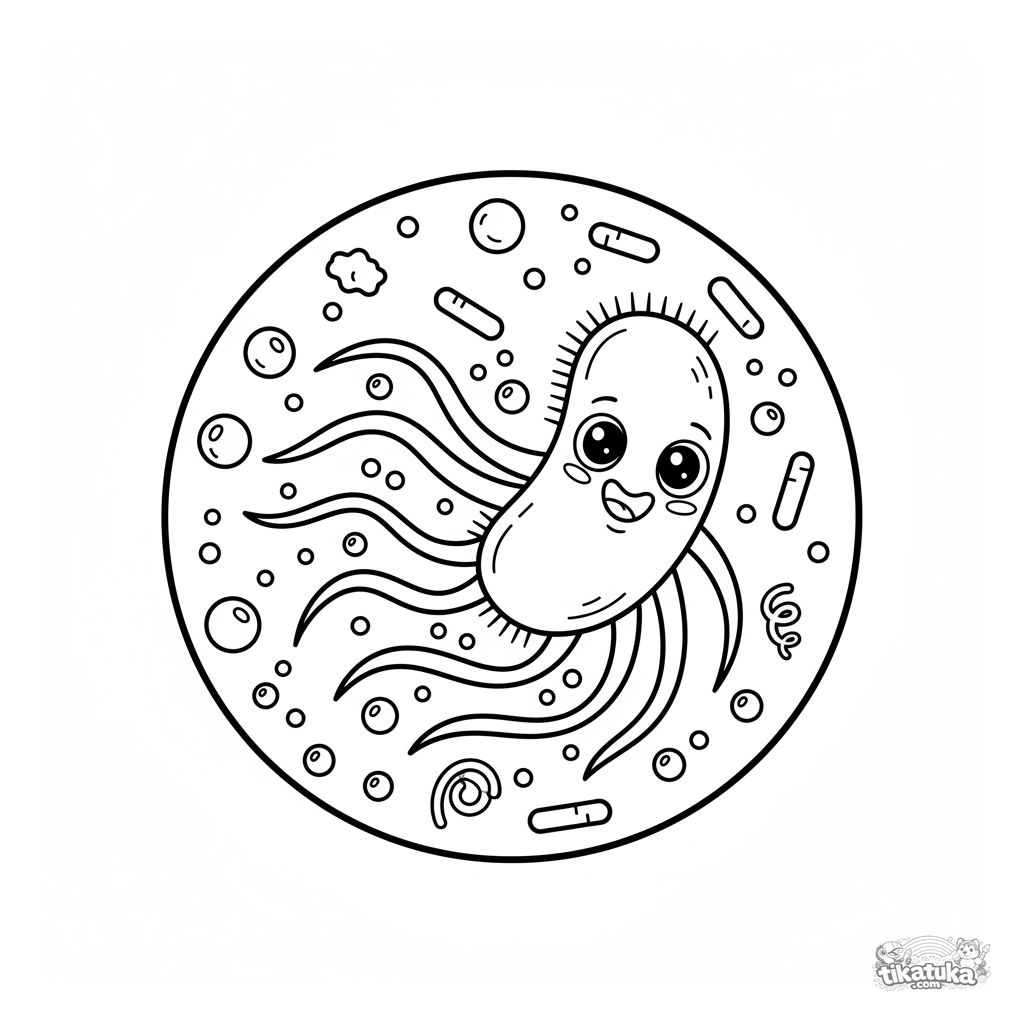 Милкая раскраска: дружелюбная бактерия с жгутиками весело гоняется внутри большой капли воды. Для детей 3-6 лет. Простые, забавные формы, понятные малышам.