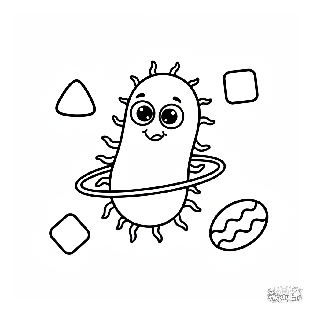 Очень простая раскраска для малышей 2-3 лет: дружелюбная бактерия крутит обруч. Крупные формы, толстые контуры, идеально для первых карандашей.