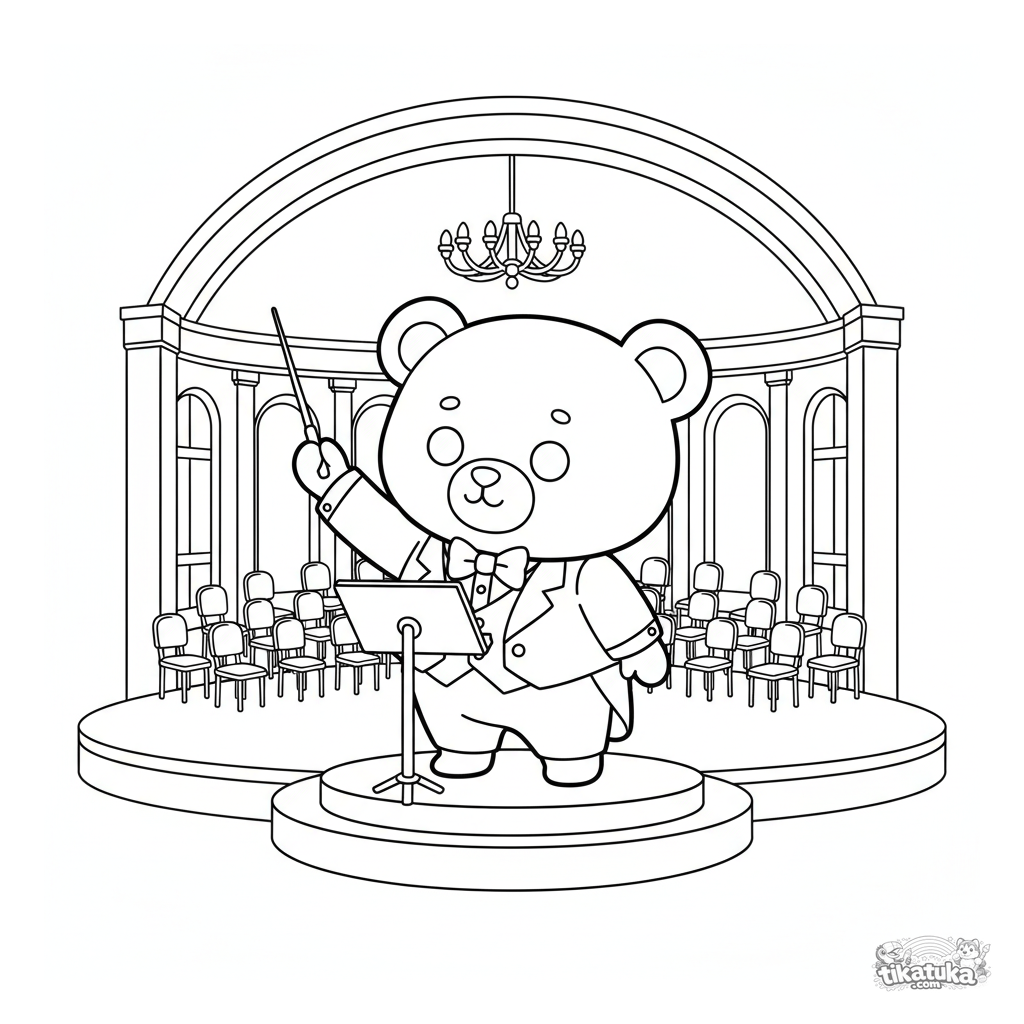 Раскраска для детей 4-6 лет: плюшевый медвежонок в смокинге дирижирует оркестром на сцене большого концертного зала.
