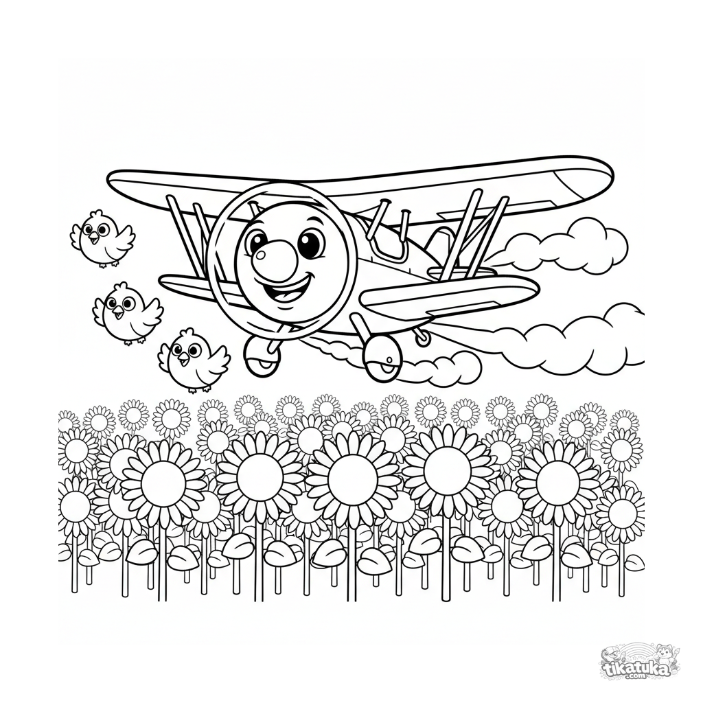 Простая раскраска самолета-опылителя для малышей 2-3 лет. У самолета улыбка на носу, он летит низко над подсолнухами. Крупные формы, толстые контуры, много свободного места.