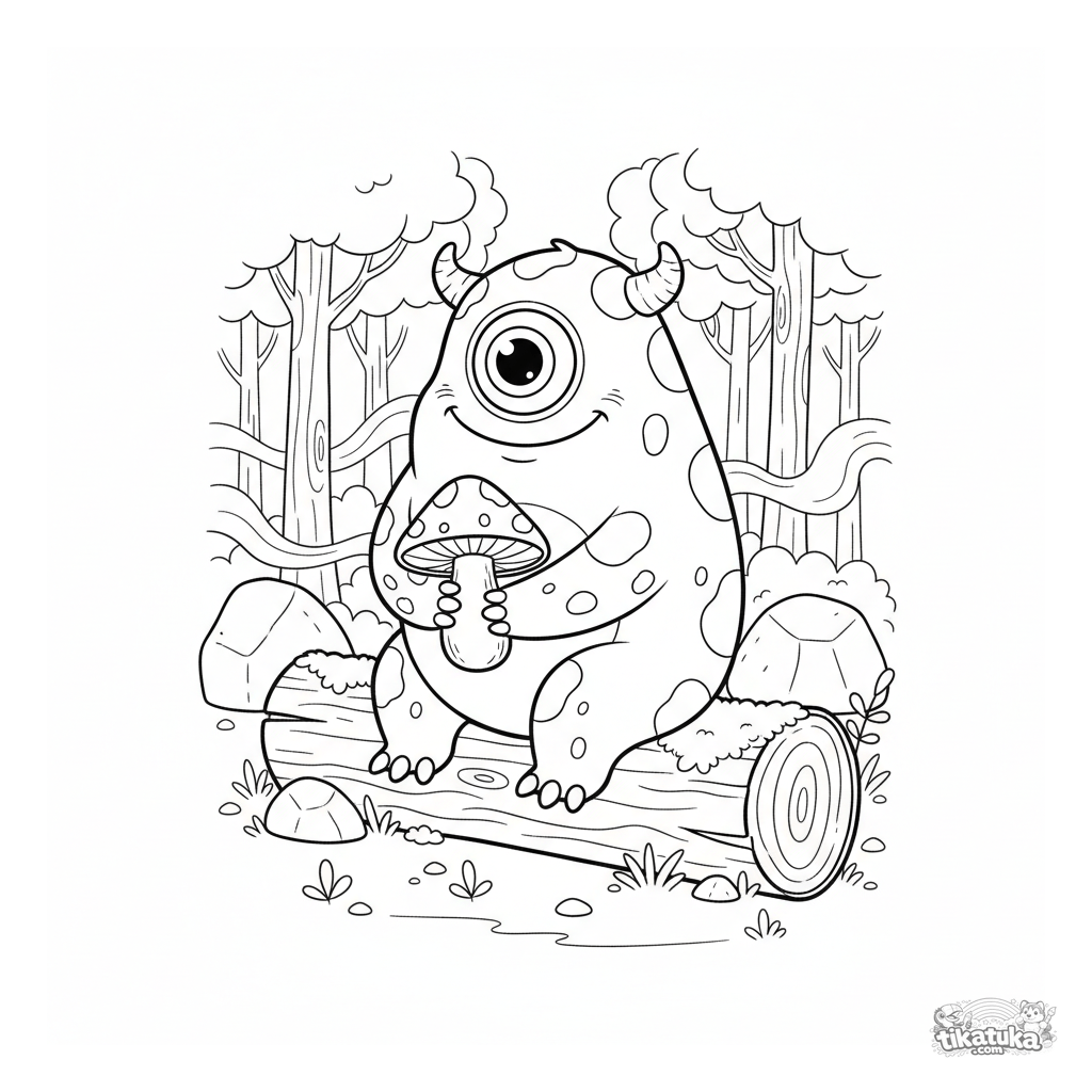 Раскраска дружелюбного циклопа с пятнистой шерстью в лесу. Для детей 4-6 лет. Монстр сидит на бревне и держит светящийся гриб, полное тело видно.