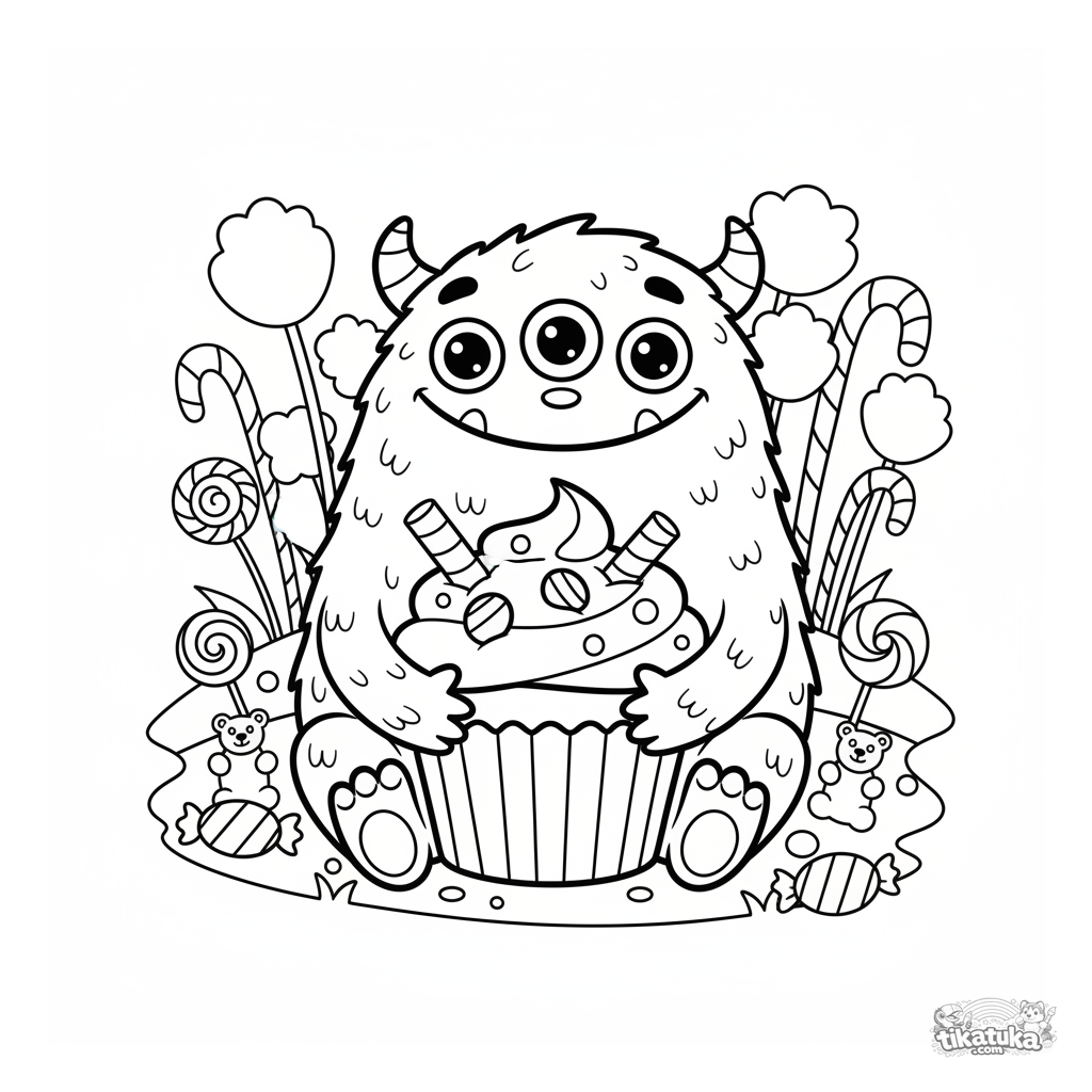 Раскраска для детей: милый пушистый монстр обнимает гигантский кекс. Забавная сцена в конфетном лугу, для возраста 4-6 лет.
