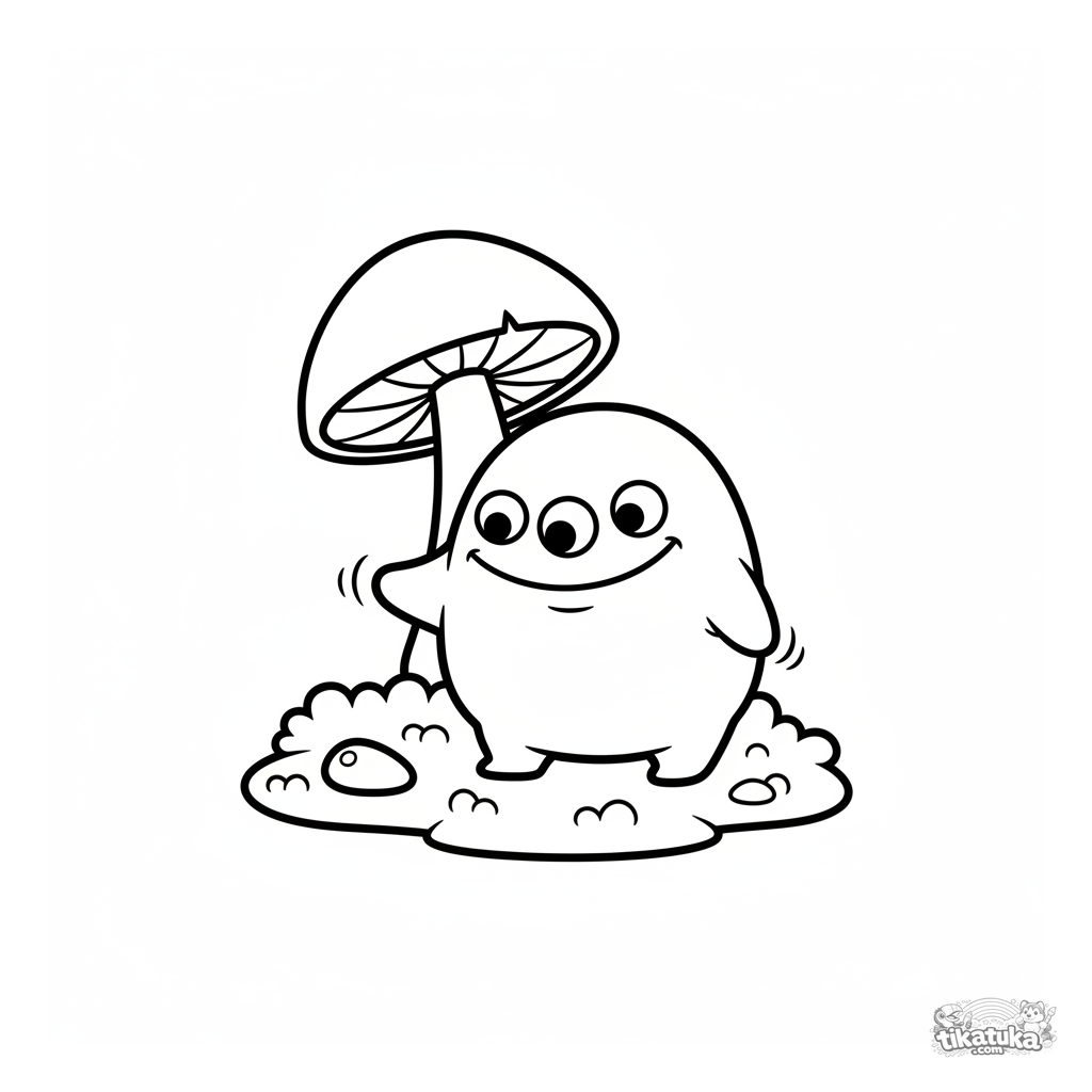 Раскраска для малышей: дружелюбный пушистый монстр-капля с тремя глазами гуляет у гриба. Простые формы, крупные детали, широкие поля для легкого раскрашивания.