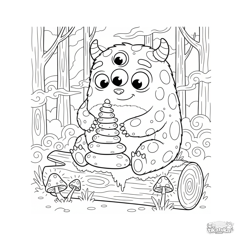 Раскраска для детей 4-6 лет: дружелюбный лохматый монстр с тремя глазами строит башню из камушков на замшелом бревне в лесной полянке.