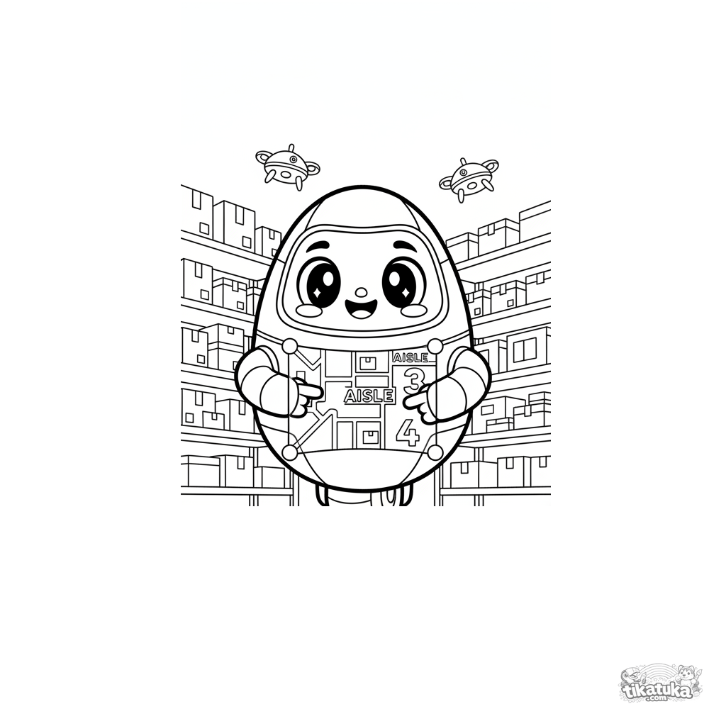 Раскраска для детей 4-6 лет: добродушный яйцевидный робот на колесе показывает голограмму карты склада, указывая путь среди высоких стеллажей. Яркая и понятная сцена.
