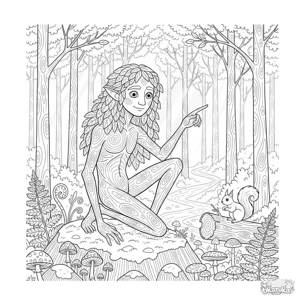 Раскраска для детей от 7 лет: добрый Леший, лесной дух славянского фольклора, показывает путь на заросшей тропинке. Детализированная сцена с грибами, папоротниками и белкой.