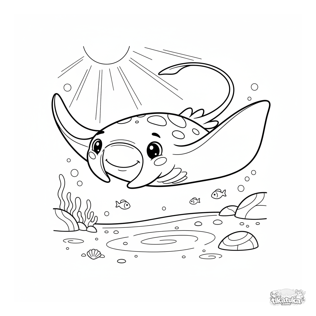 Раскраска с дружелюбным скатом, плавно скользящим над песчаным дном на солнечном мелководье. Для детей 7-9 лет. Элегантные линии, умеренная детализация.