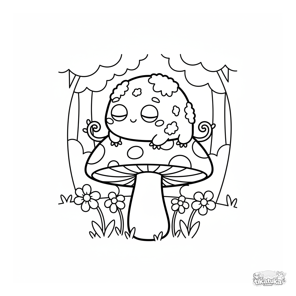 Простая раскраска для малышей 2-3 лет: дружелюбный моховой монстрик спит на большой поганке в лесу. Крупные формы, мало деталей.
