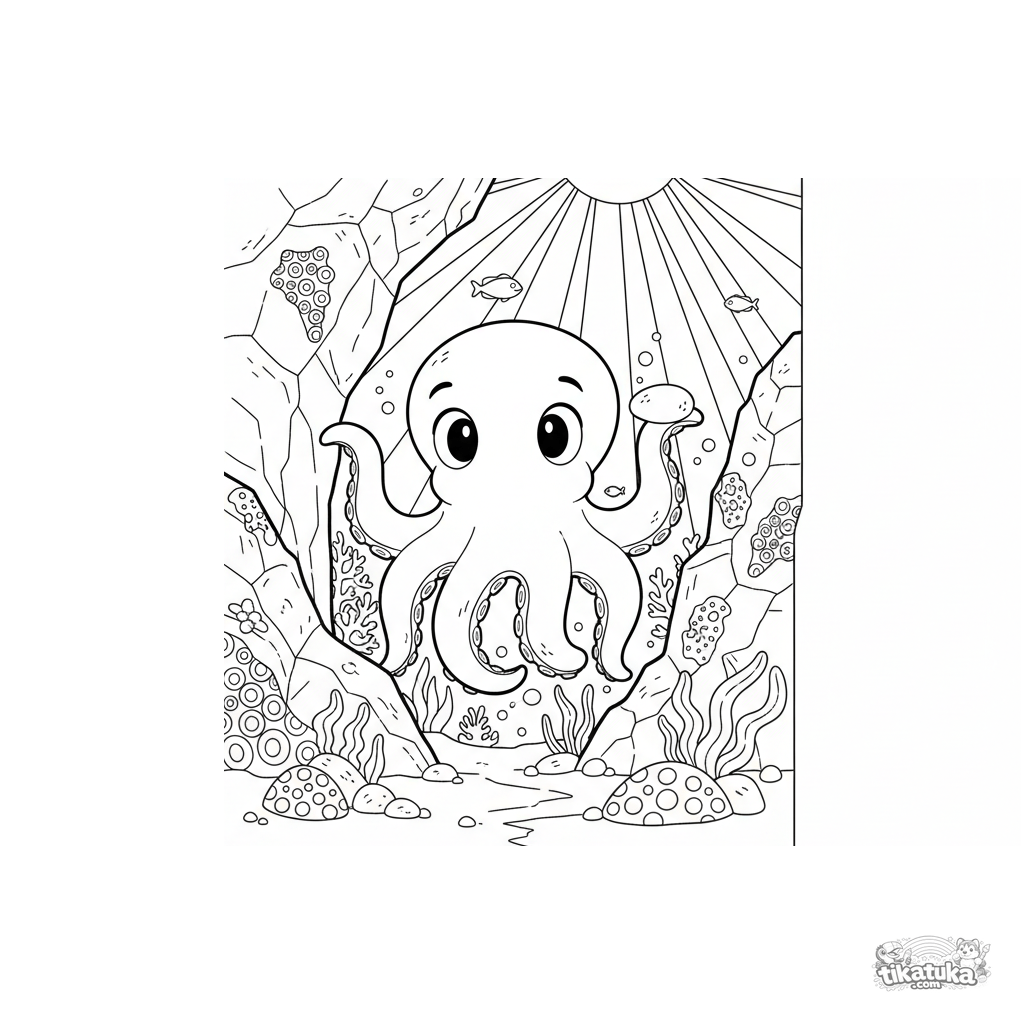 Раскраска с весёлым осьминогом, играющим в прятки среди скал на солнечном мелководье. Для детей 4-6 лет. Яркая и забавная подводная сцена.