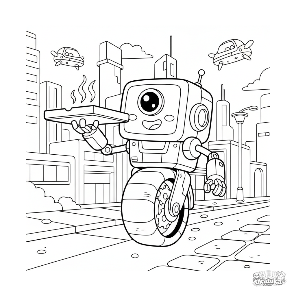 Раскраска для мальчиков: дружелюбный робот-доставщик на моноцикле везет пиццу по городу будущего. Для детей 4-6 лет. Забавная и динамичная сцена.