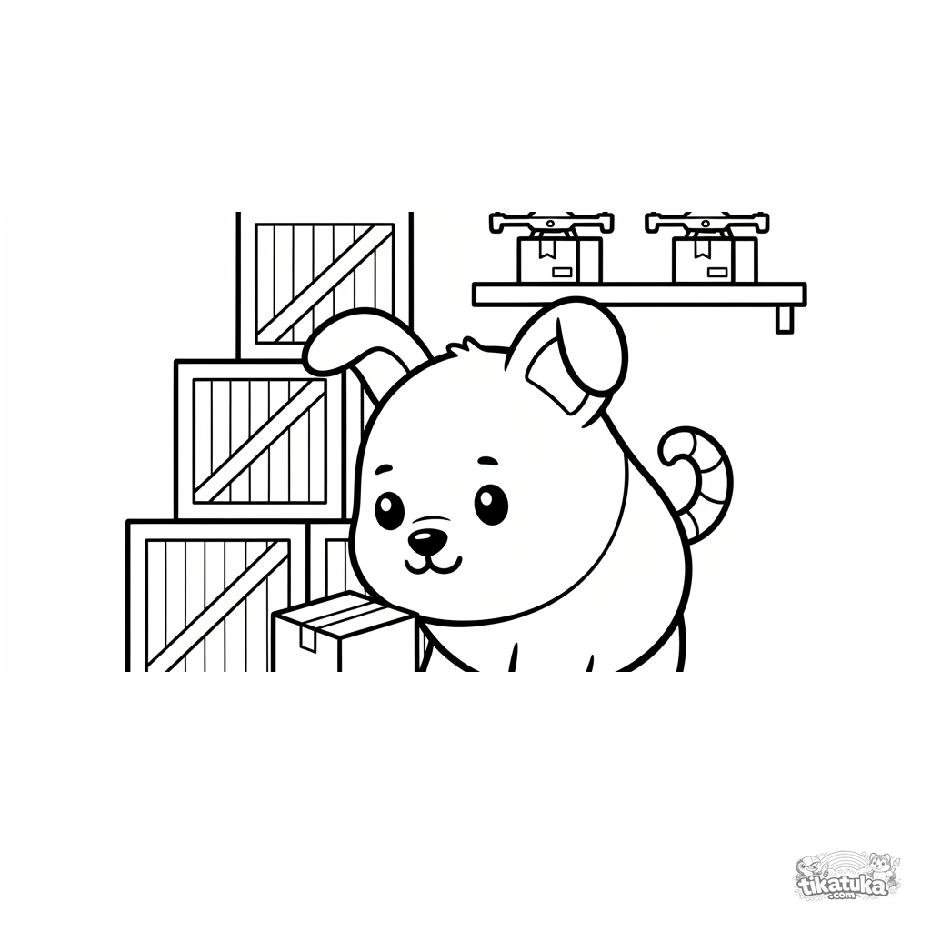 Раскраска для малышей: милый робот-собака играет с коробкой на большом складе среди стеллажей и дронов. Простые формы и широкие поля для легкого раскрашивания.