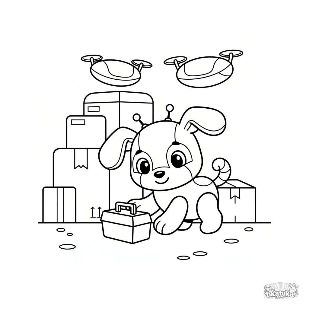 Раскраска для малышей: милый робот-собака играет с ящиком для инструментов на складе среди коробок и летающих дронов. Простые формы, широкие поля.