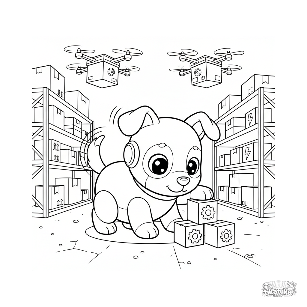 Раскраска для детей 4-6 лет: милый робот-собака сортирует коробки на складе среди дронов. Простые формы и дружелюбный персонаж.