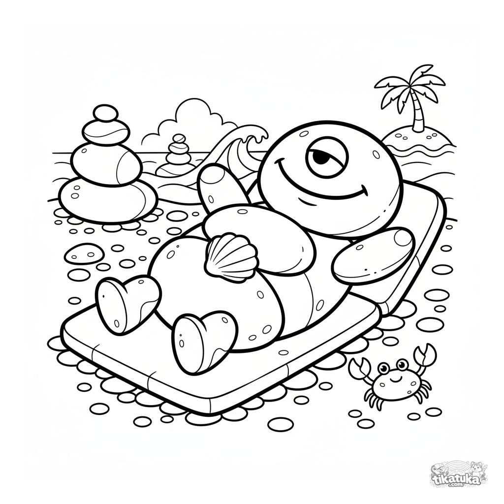 Раскраска с дружелюбным каменным монстром, который загорает на галечном пляже. Для детей 3-6 лет. Милая и спокойная сцена с забавным персонажем.