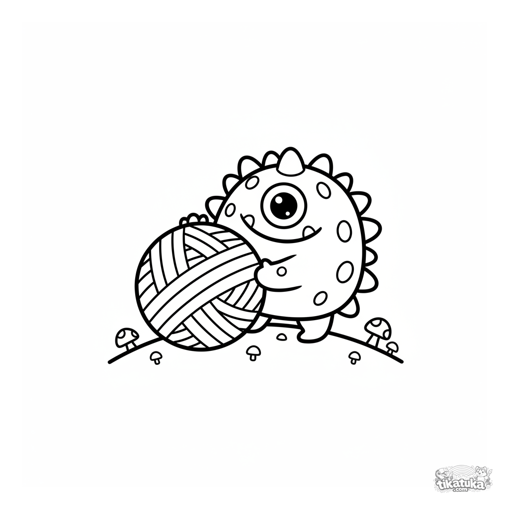 Раскраска для малышей: добрый колючий монстр с одним глазом катит большой клубок пряжи по травянистому холму. Простые формы и широкие поля.