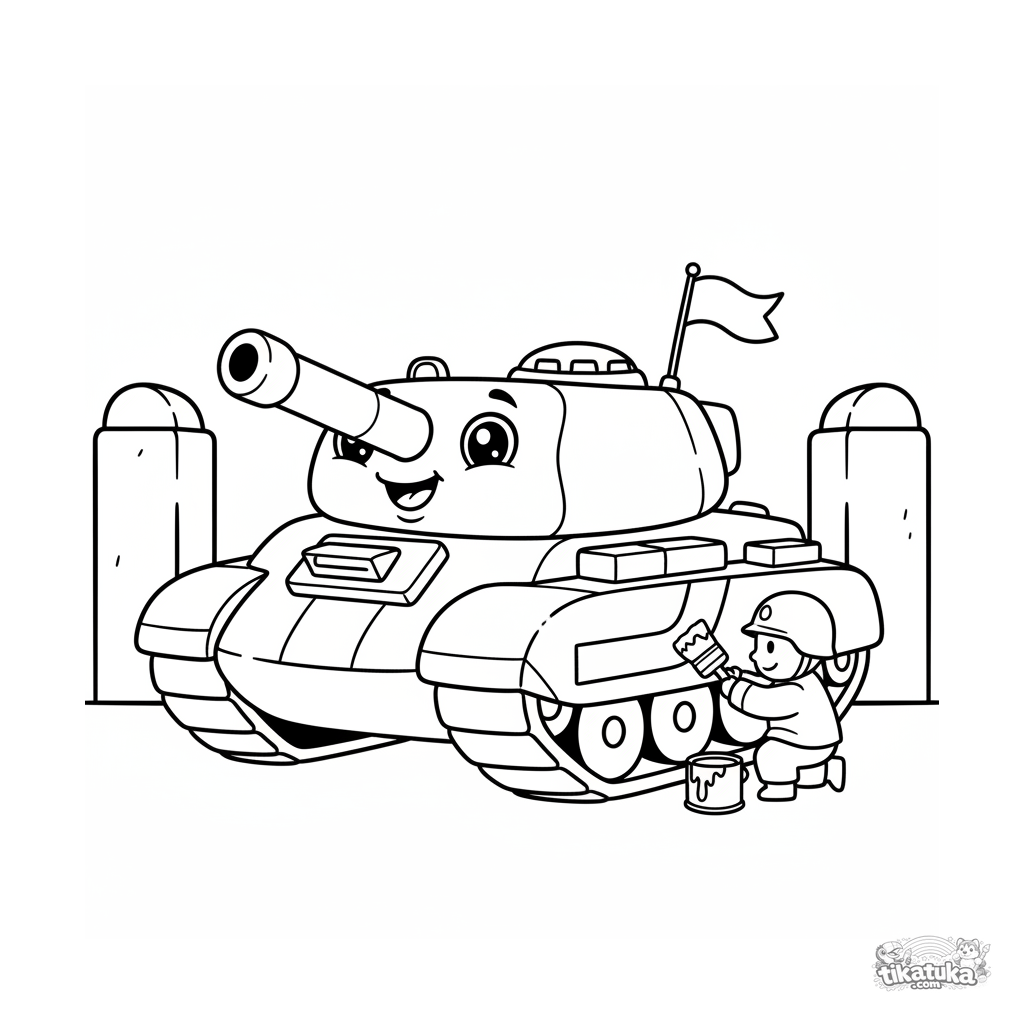 Очень простая раскраска для малышей 2-3 лет: дружелюбный танк стоит на страже у входа в полевой лагерь. Крупные формы, минимум деталей, широкие поля.