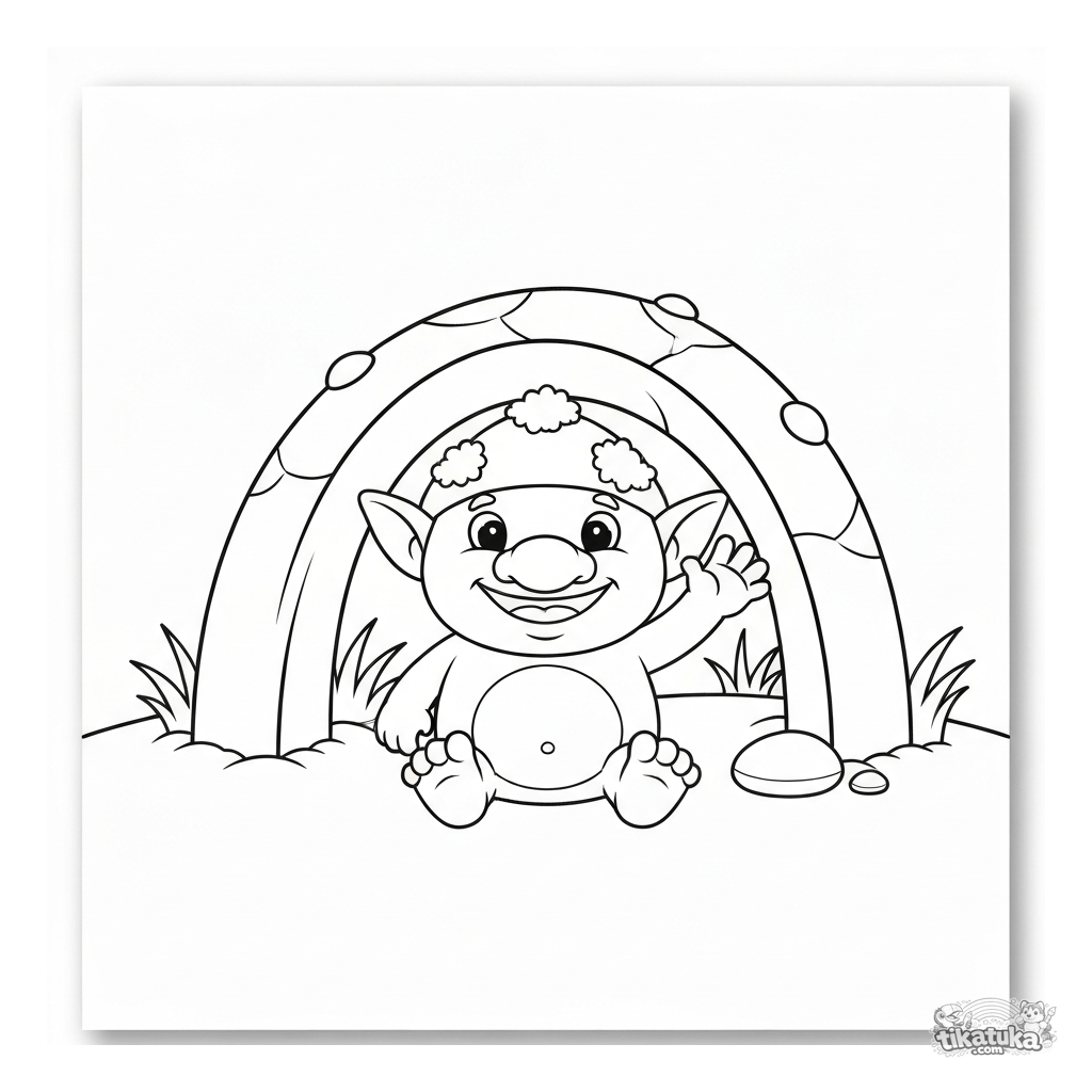Раскраска для детей: дружелюбный тролль сидит под волшебным мостом из гриба. Простой рисунок с крупными деталями для малышей 2-5 лет.