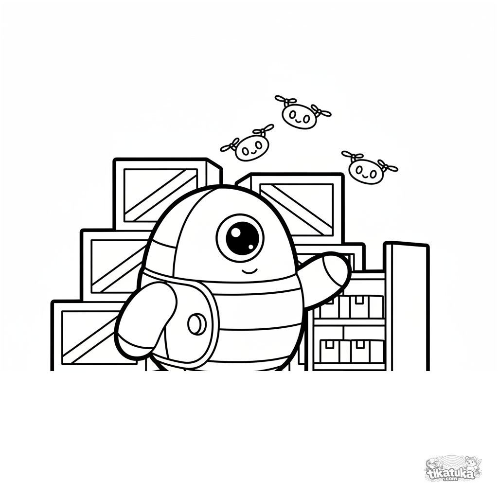 Раскраска для малышей 2-3 лет: дружелюбный круглый робот сортирует коробки на складе среди стеллажей и летающих дронов. Простые формы, широкие поля.