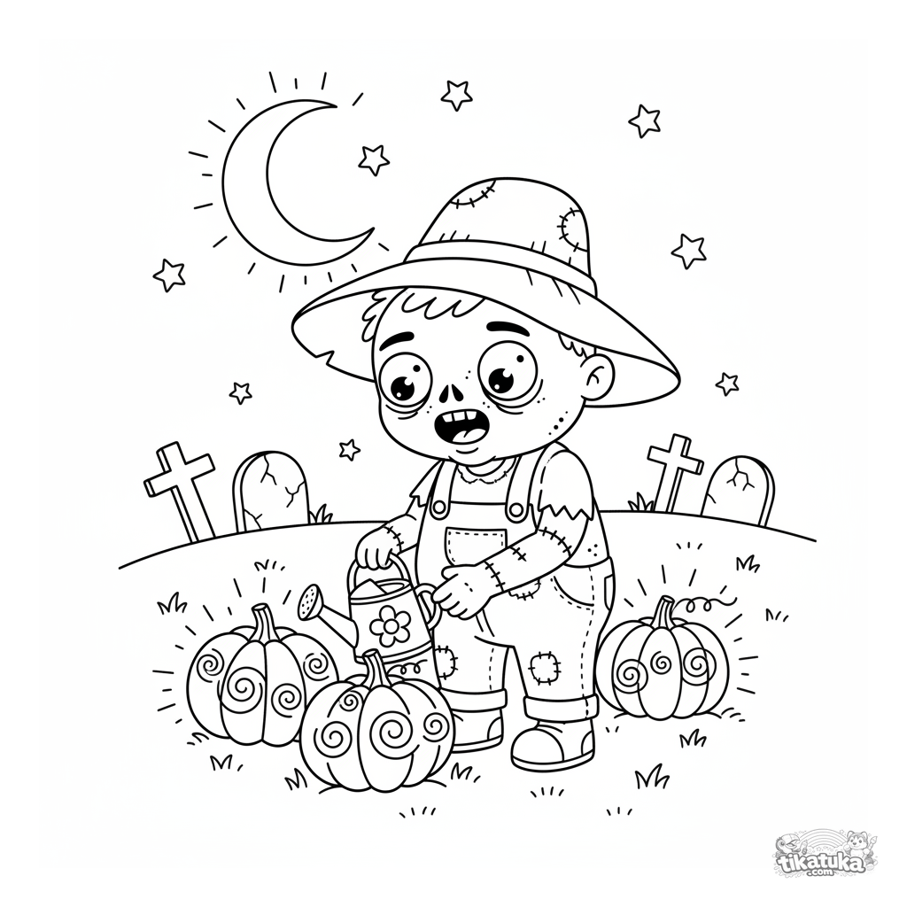 Раскраска для детей: дружелюбный зомби-садовник поливает светящиеся тыквы в ночном саду. Забавная нестрашная тема, подходит для детей 4-6 лет.
