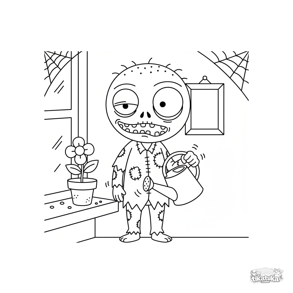 Раскраска с дружелюбным зомби для мальчиков 4-6 лет. Зомби в рваной одежде поливает цветок в горшке на подоконнике в пыльной комнате.