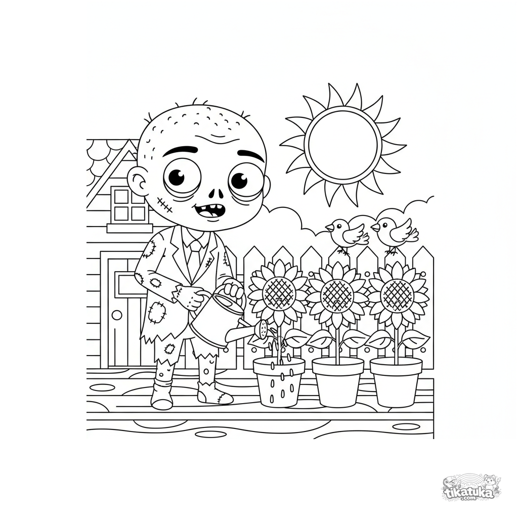 Раскраска с дружелюбным зомби-садоводом для мальчиков 4-6 лет. Зомби в рваном костюме поливает горшечные подсолнухи на крыльце.
