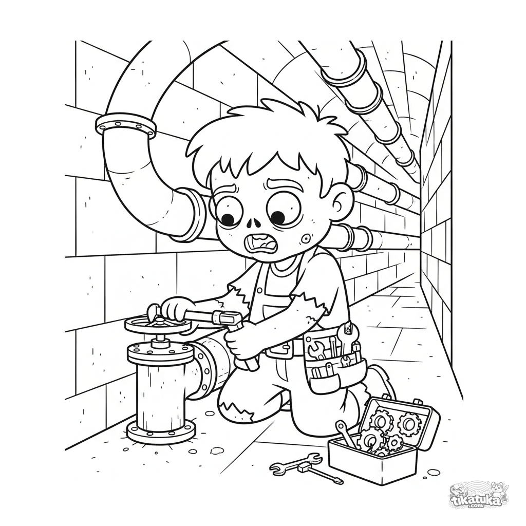 Раскраска для детей 4-6 лет: дружелюбный зомби-водопроводчик чинит трубу в канализационном коллекторе. Весёлая и нестрашная сцена для творчества.
