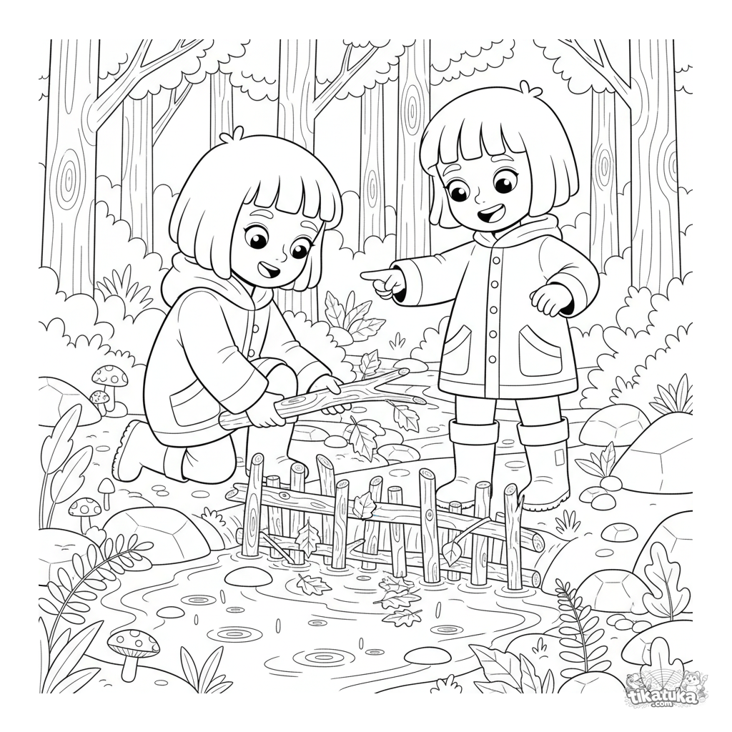 Раскраска для детей 10-12 лет: двое друзей в дождевиках строят плотину из листьев и палок в лесном ручье под осенним дождём. Сложная сцена, много деталей.