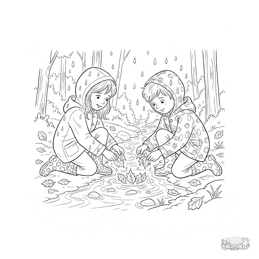Раскраска для детей 10-12 лет: двое друзей в дождевиках строят плотину из листьев в лесном ручье под осенним дождём.