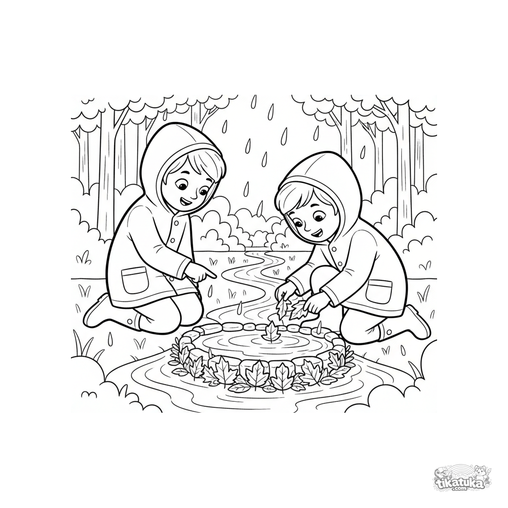 Раскраска для детей 7-9 лет: двое друзей в дождевиках строят плотину из листьев в осеннем ручье под дождём. Сцена с действием, умеренная детализация, выразительные позы.