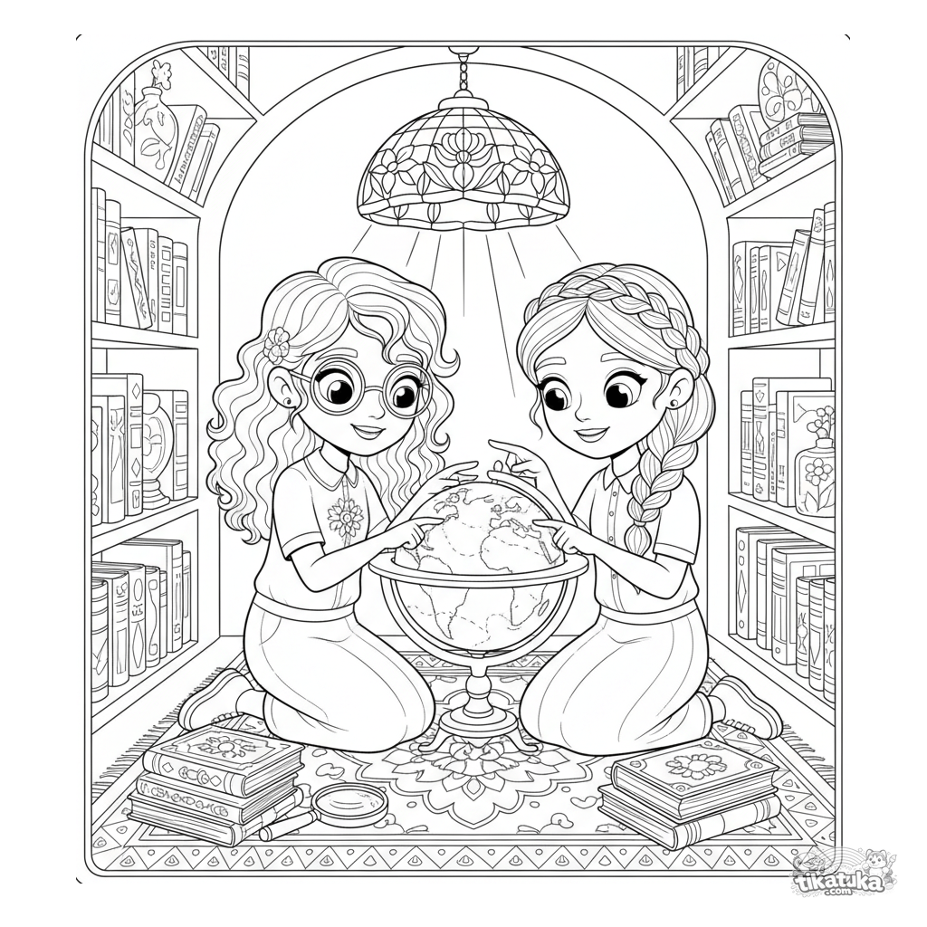 Раскраска для детей 10-12 лет: две подруги в уютном уголке библиотеки праздничного зала изучают старинный глобус. Высокий уровень детализации, декоративные элементы в стиле модерн.