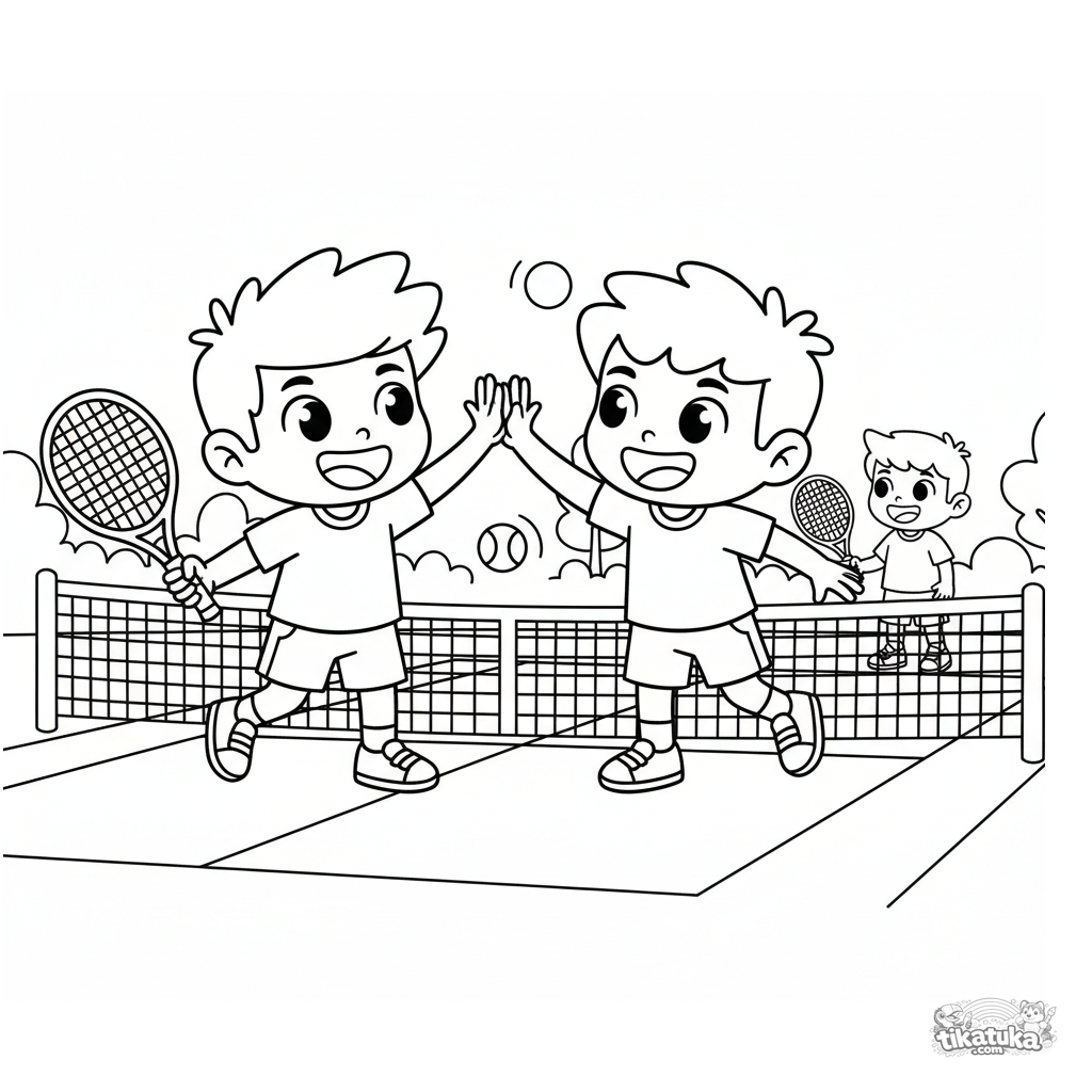 Раскраска для детей 7-9 лет: две пары друзей играют в парный теннис, одна пара радостно празднует выигранный очко. Динамичная сцена с сеткой и ракетками.