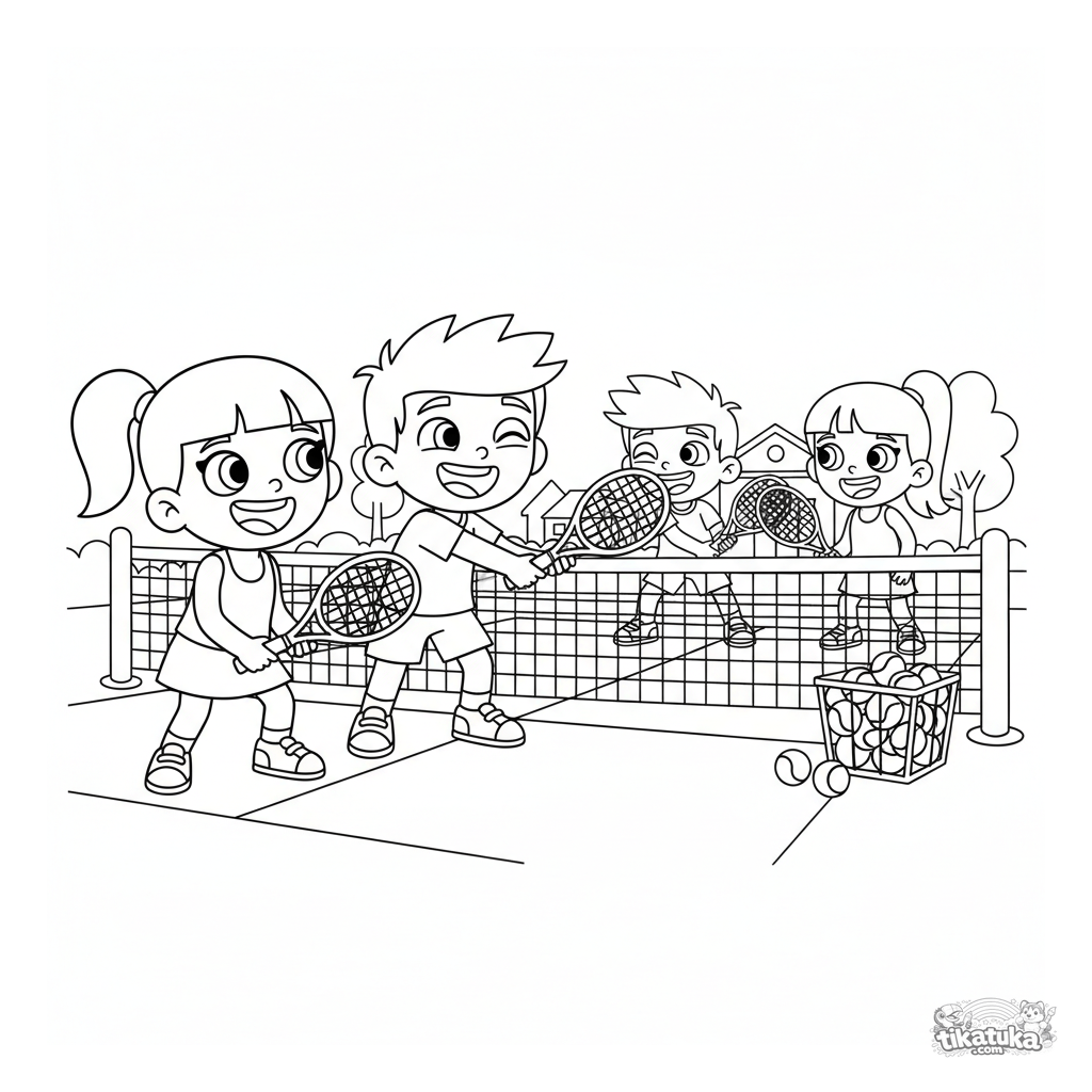 Раскраска для детей 7-9 лет: весёлая сцена парного тенниса, где четверо друзей играют и смеются на корте. Динамичные позы, сетка, ракетки.