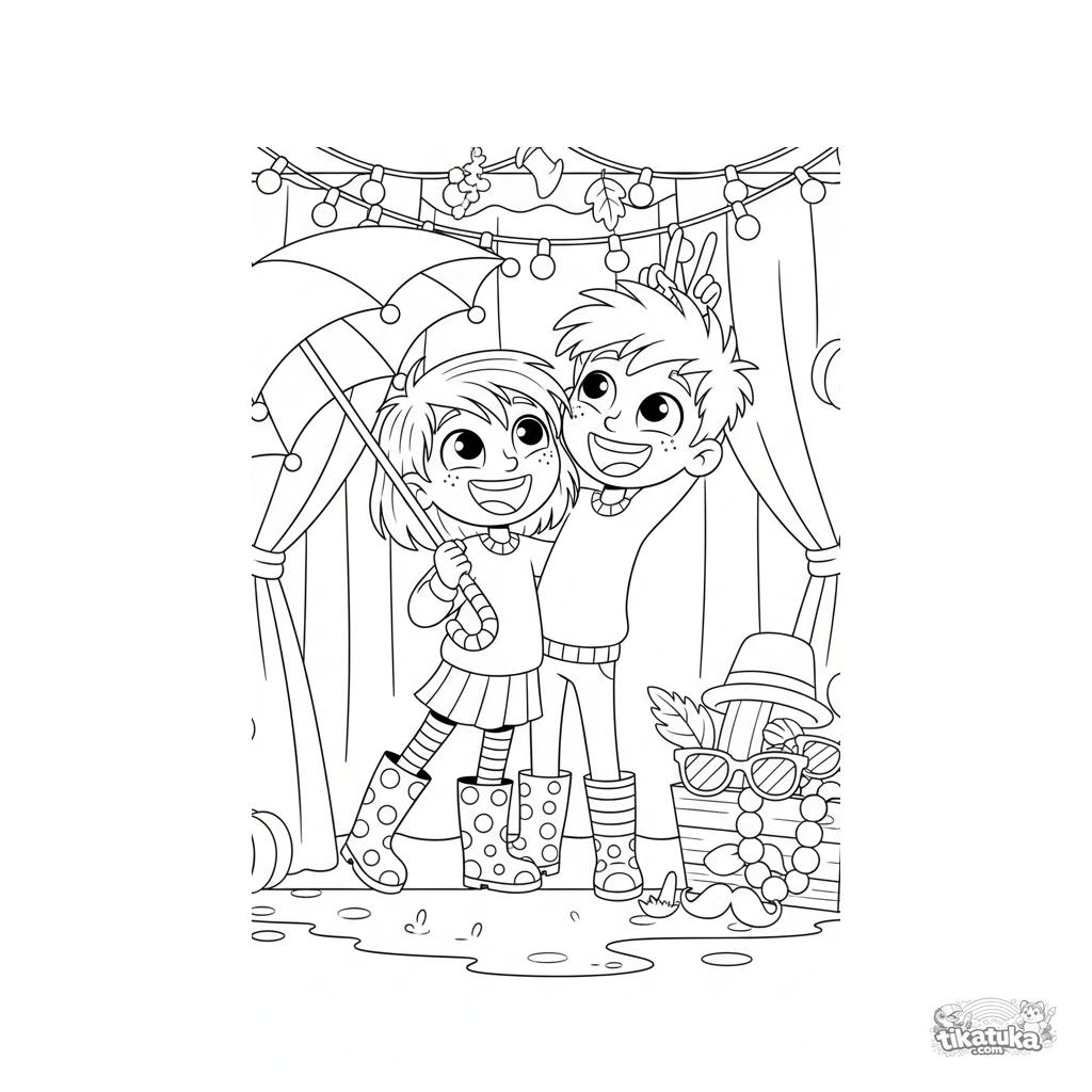 Раскраска для детей 7-9 лет: два друга веселятся в фото-будке на осенней ярмарке в дождь. Выразительные позы, умеренный фон, понятные контуры.
