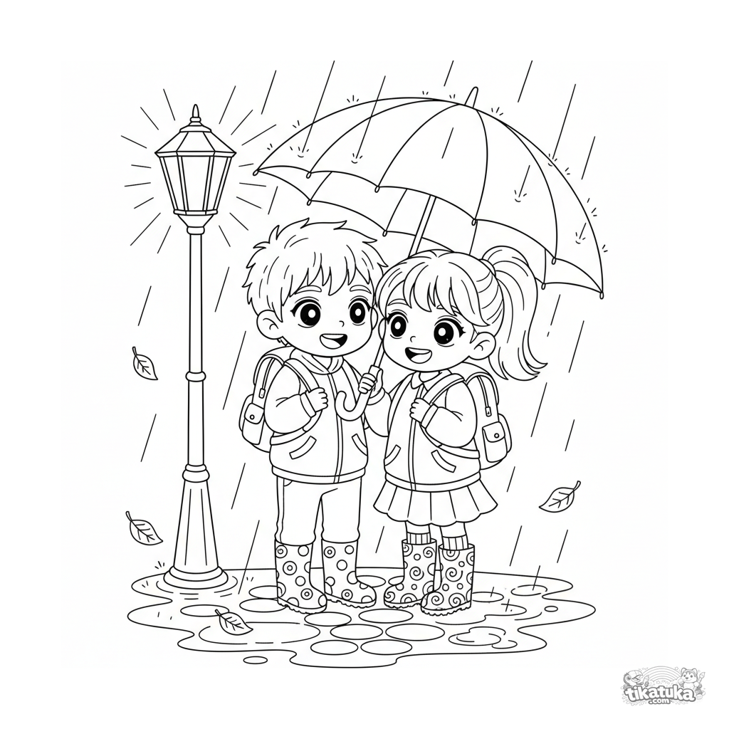 Детальная раскраска для детей 10-12 лет: двое друзей под одним полосатым зонтом у уличного фонаря в дождливый осенний вечер, в сапогах и с рюкзаками.