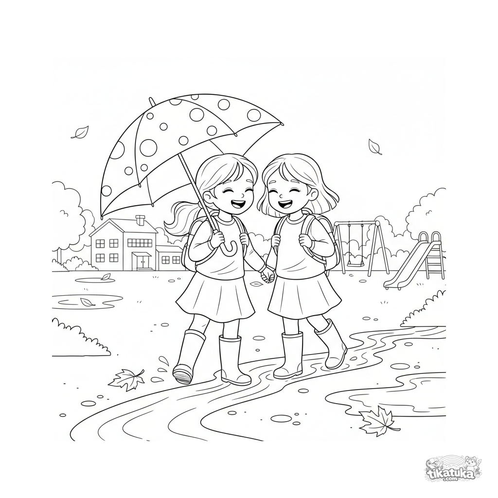 Раскраска для детей 7-9 лет: двое друзей под одним зонтом идут по мокрому школьному двору осенью. Сцена с настроением, умеренная детализация одежды и фона.