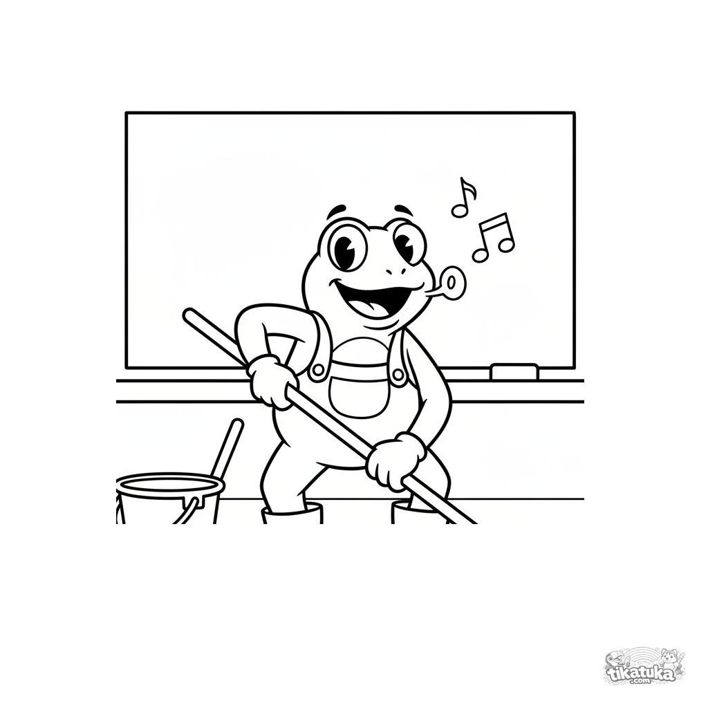 Раскраска для малышей 2-3 года: веселый лягушонок-уборщик в комбинезоне моет пол под школьной доской в классе, простые крупные формы.