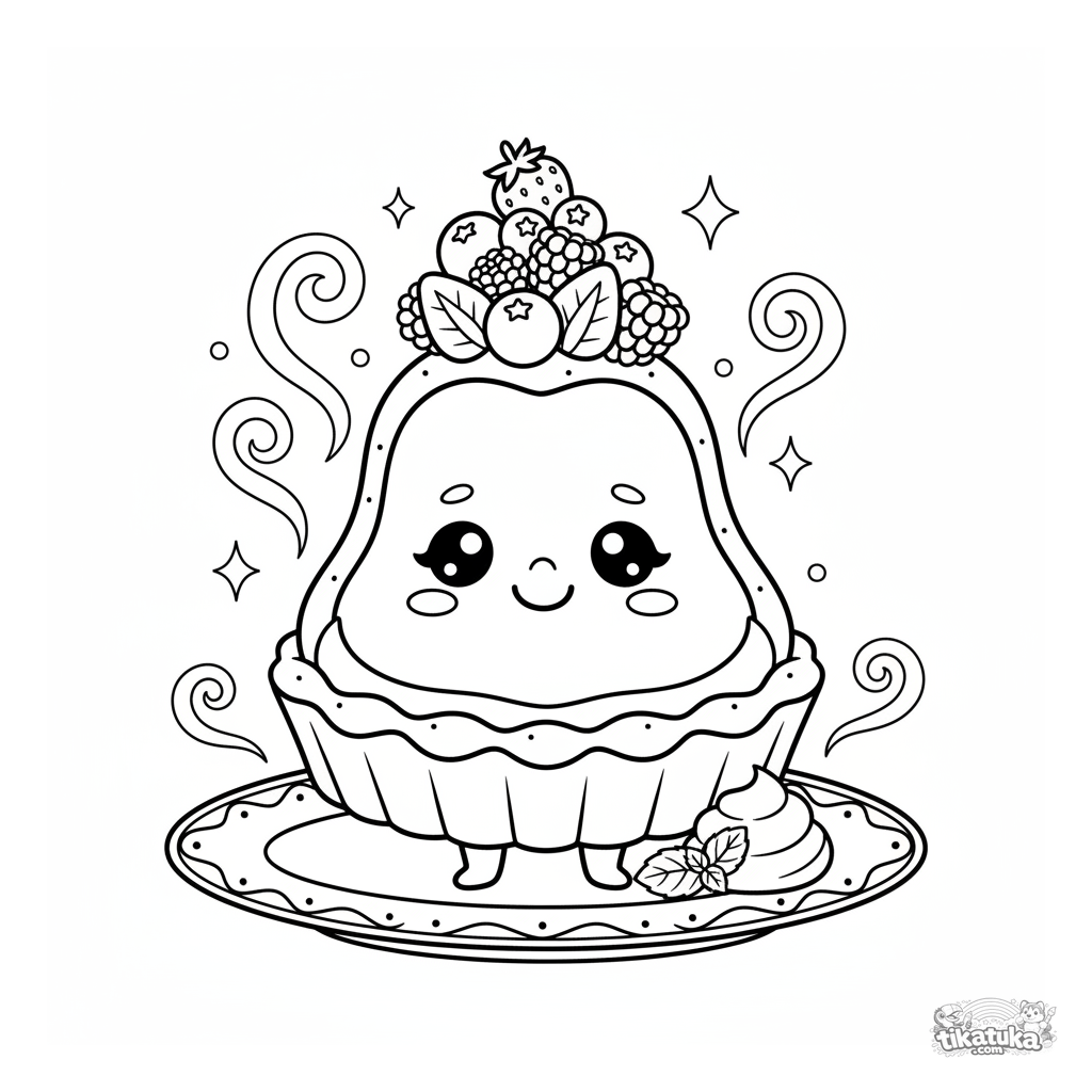 Раскраска для детей: улыбающийся фруктовый тарт балансирует ягодами на голове, стоя на тарелке. Забавная и милая сцена для детей 4-6 лет.