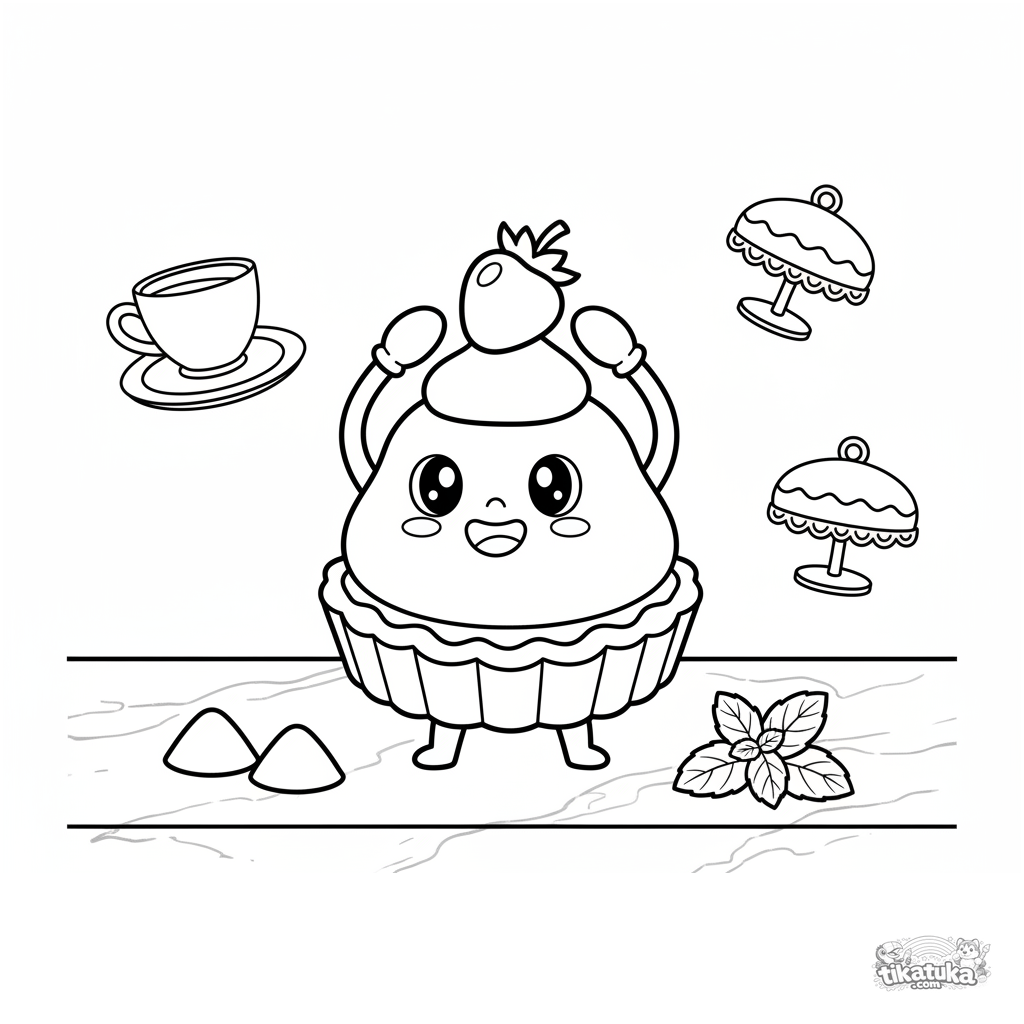 Раскраска: фруктовый тарт балансирует ягодой на мраморной стойке кафе. Забавная сцена с сахарной пудрой и мятой. Для детей 4-6 лет.