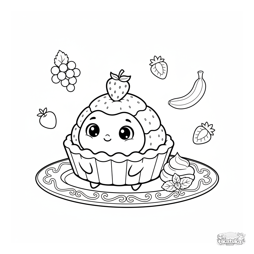 Раскраска с фруктовым тартом, балансирующим ягодой на тарелке. Для детей 4-6 лет. Изображен улыбающийся тарт с заварным кремом, держащий ягоду на корочке.