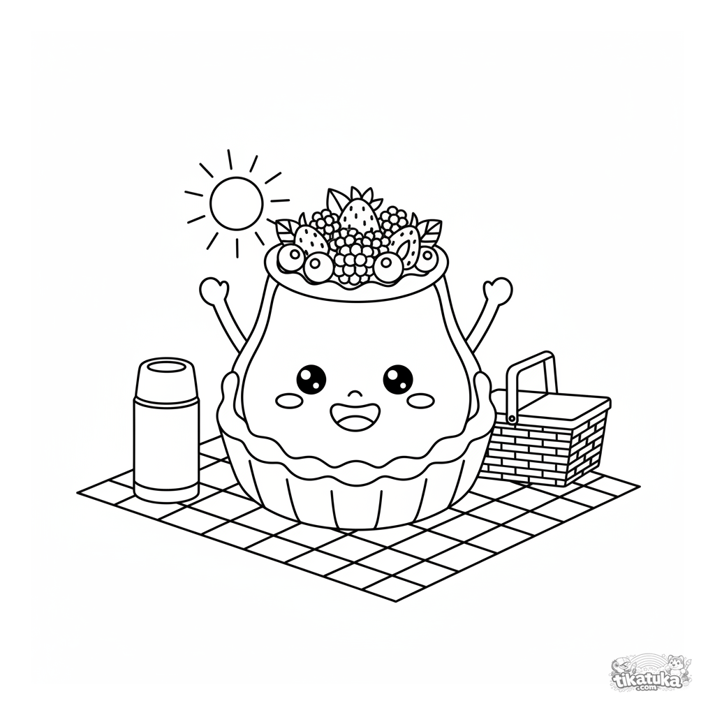 Детская раскраска: весёлый фруктовый тарт с ягодами празднует на пикнике. Красочная сцена с клетчатым пледом для творчества детей 4-6 лет.