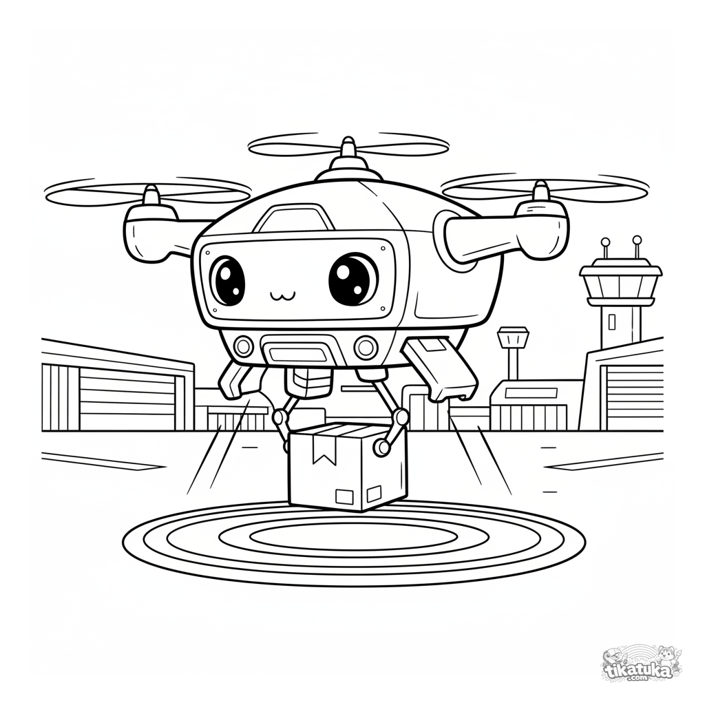 Раскраска для мальчиков: футуристический дрон-доставщик завис над аэродромом, чтобы опустить посылку. Чёткие геометрические формы и интересные детали.