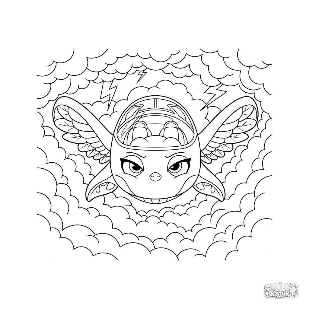 Раскраска для детей 10-12 лет: футуристический летательный аппарат прорывается сквозь грозовое небо с молниями. Динамичные линии, детализированный дизайн.
