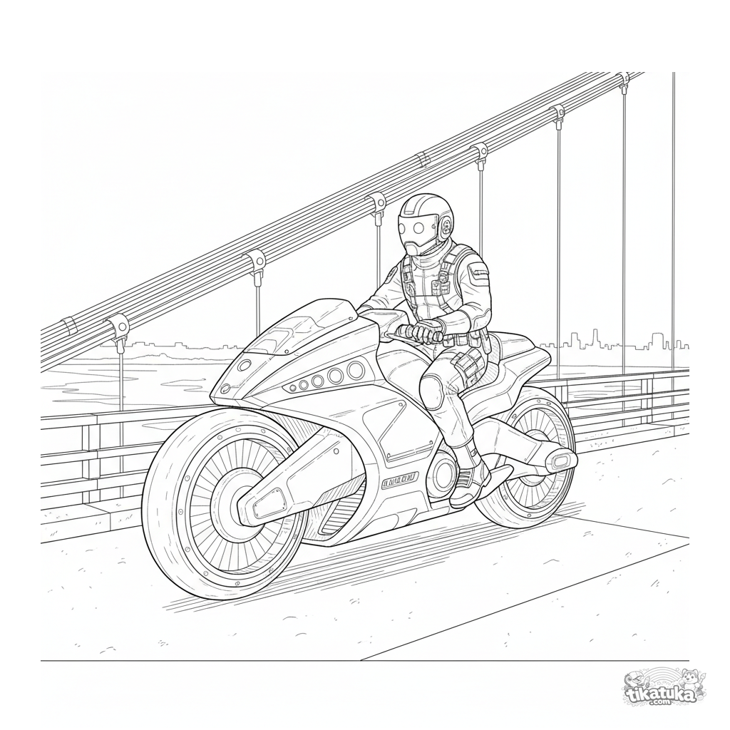 Раскраска для детей 10-12 лет: футуристический ховербайк патрулирует подвесной мост над рекой. Офицер в шлеме сканирует местность. Детализированный технический рисунок.